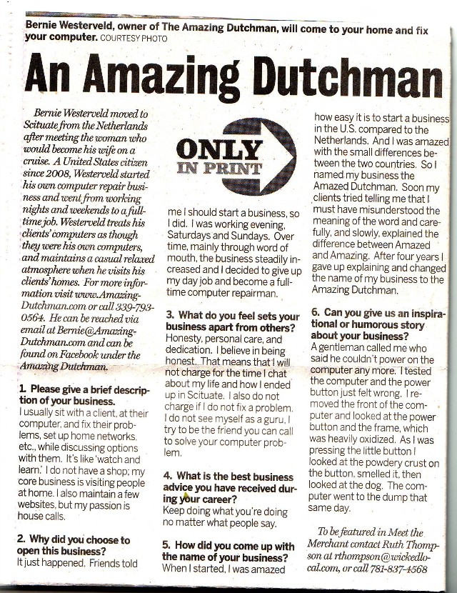 Home: (781) 545 - 0659 Cell: (339) 793 - 0564 Bernie@AmazingDutchman.com